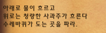 | 17번 위치 | ![]() 아래로 물이 흐르고 위로는 청량한 사과주가 흐른다 수레바퀴가 도는 곳을 파라 |