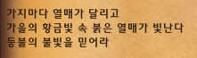 | 24번 위치 | ![]() 가지마다 열매가 달리고 가을의 황금빛 속 붉은 열매가 빛난다 등불의 불빛을 믿어라 |